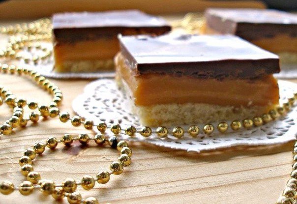 Пока карамель не застыла, быстро выложить ее на тесто. Шоколад растопить на водяной бане. Растопленный шоколад выложить на карамель и поставить это счастье в холодильник на два часа. Разрезать на квадраты и съесть.