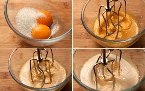 2. Желтки и 75 г сахара взбить в пену.