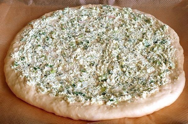 5. Круг из теста присыпать манкой (это нужно чтобы уберечь тесто от размокания). Распределить по поверхности теста творог с зеленью, затем куриное филе и сверху посыпать тертым сыром.