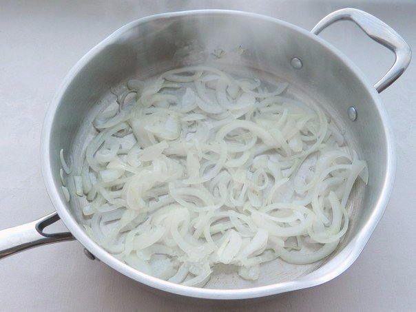 6. Вторую луковицу нарезать полукольцами и обжарить на растительном масле до золотистого цвета.