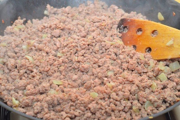 4. Добавьте фарш, посолите, поперчите и жарьте до готовности.