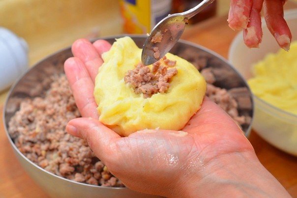 5. Слегка смажьте руки водой или маслом. Сформируйте котлетки. Из картошки сделайте продолговатую лепёшку на руке, в середину положите начинку, соедините края лепёшки.