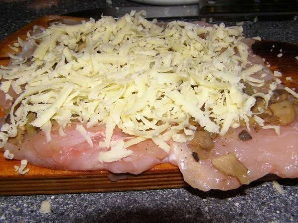 На грудки выложить грибы с луком, сверху посыпать их тертым сыром,свернуть рулетиками, заколоть зубочистками и обжарить на сковородке в масле с двух сторон до румяной корочки.