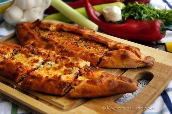 Готовые пиде выложить на блюдо (я на доску). Подают их разрезанными на части.