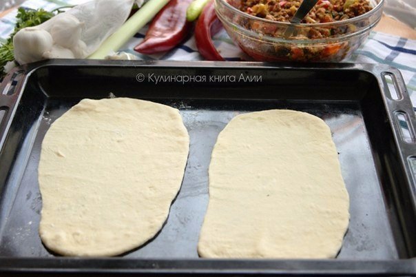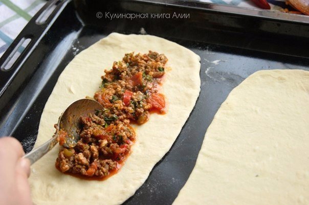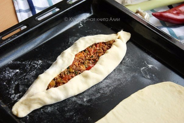 Тесто разделить на 8 кусочков. Раскатать из кусочка овал, положить на противень, застеленный бумагой (я забыла бумагой застелить, потом их еле-еле отодрала от противня, потом застелила противень, и всё отлично отходило). Выложить по длине овала начинку, примерно 1,5 ложки (или смотрите сами,но чтобы начинки хватило на 8 пиде). Края завернуть, кончики защипнуть. Лодочка должна получиться узкая.