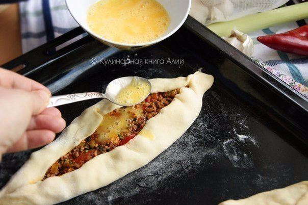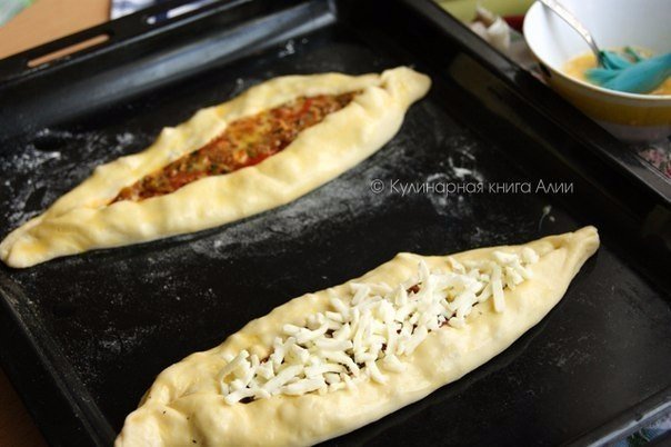 Яйцо взбить вилкой, добавить в серединку немного. Края теста смазать яйцом (Ахмет не смазывал края, поэтому как хотите). Вторую лодочку посыпать сыром (у меня Моцарелла) и так же края смазать яйцом. На противень можно и 3 и 4 штучки уместить, но лучше, если они будут не очень близко друг к другу.