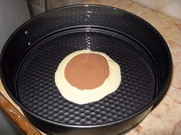 5. Выкладывайте в центр формы столовой ложкой поочередно белое и шоколадное тесто.