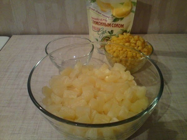 Выкладываем на мясо кусочки ананасов и кукурузу.