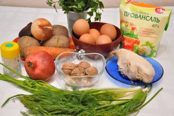 Следом идет слой измельченных орехов, майонез и зерна граната