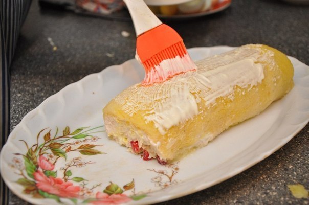 С помощью пищевой пленки сворачиваем рулет и убираем в холодильник примерно на час.