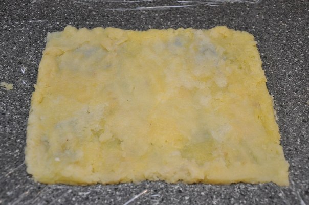 Картофель отвариваем в мундире, чистим и натираем на терке. Равномерно выкладываем на пищевую пленку в форме прямоугольника и плотно прижимаем, чтобы при скручивании рулет не развалился. Солим и смазываем майонезом.