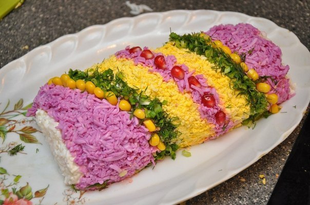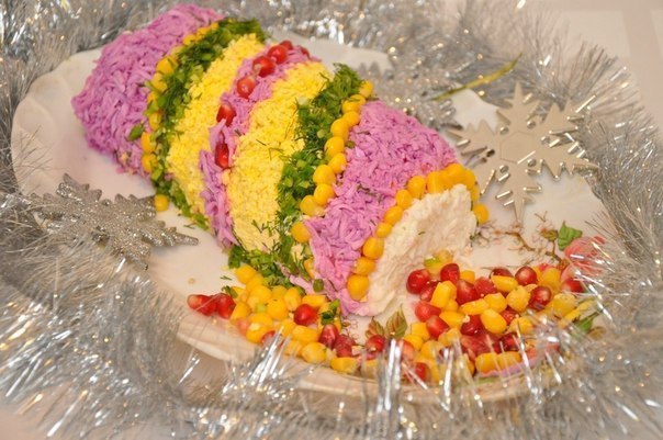 Украшаем хлопушку рядами окрашенного белка, тертыми желтками, мелко порезанной зеленью.