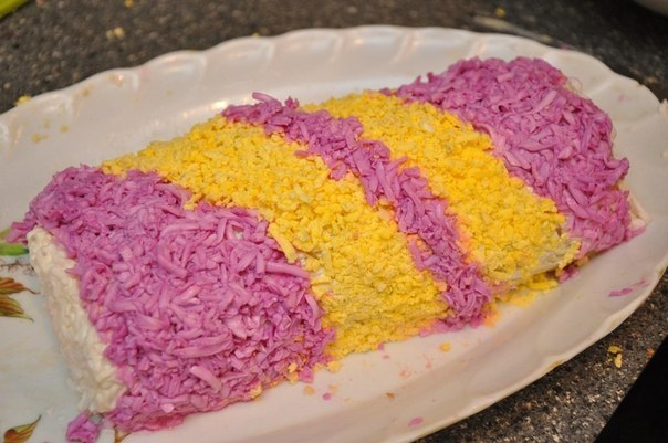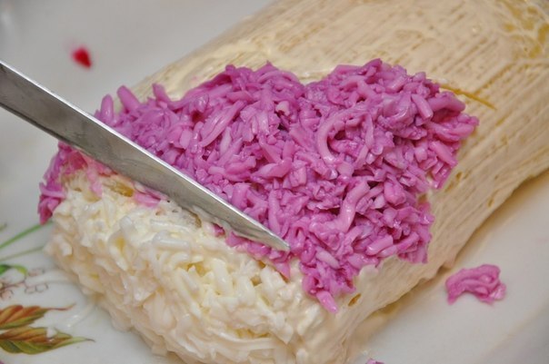 Половину белков окрашиваем соком тертой свеклы в розовый цвет. Неокрашенной половиной белков посыпаем бока хлопушки