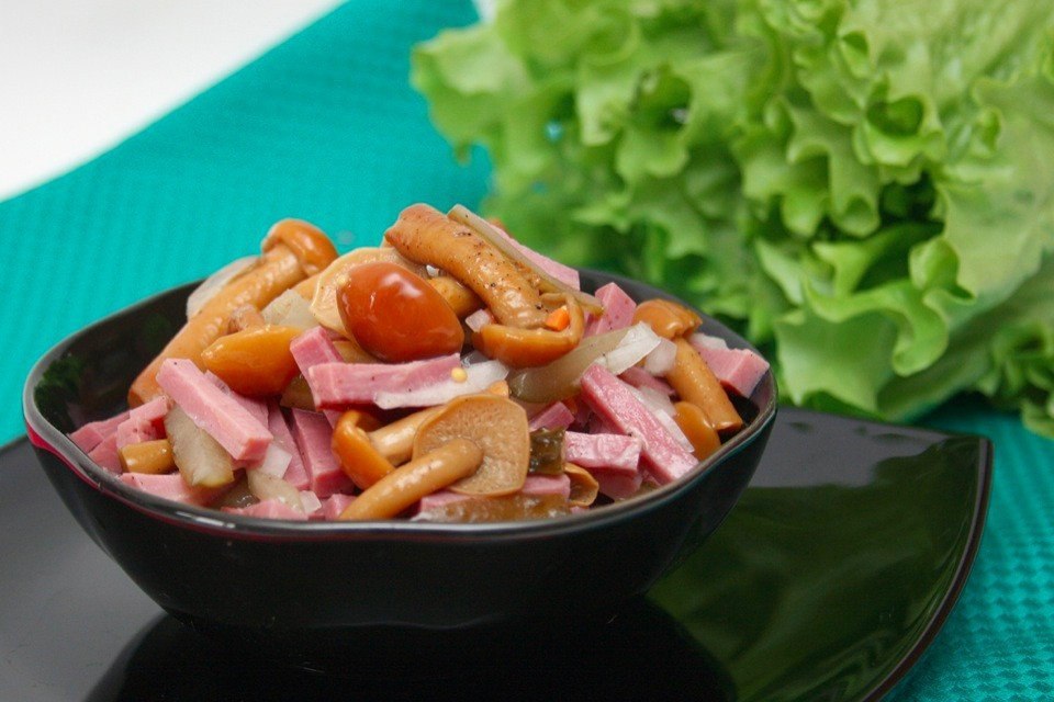 4. Соедините всё с опятами. Посолите и поперчите очень осторожно: все ингредиенты уже, как правило, соленые и перченые. По желанию добавьте мелко нарезанный лук. Заправьте обычным майонезом.