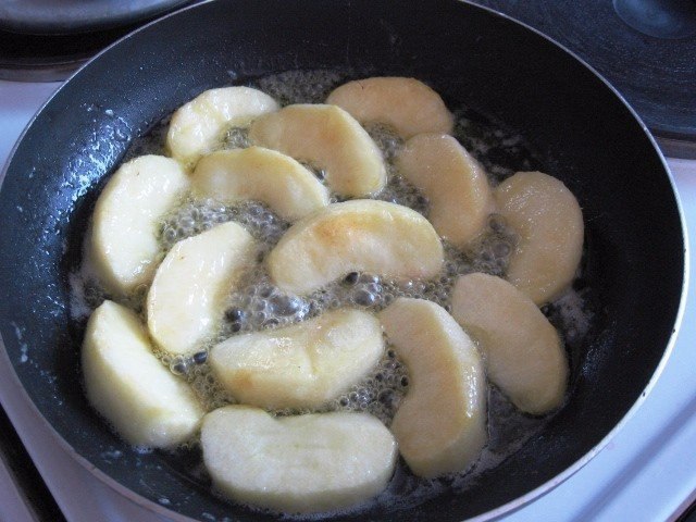 Очистить яблоки и порезать на дольки.Затем обжарить на сковороде (которую можно потом поставить в духовку) на сливочном масле.Посыпать сахаром. 5 минут с одной стороны и 3 мин. с другой