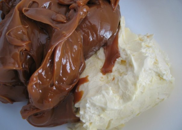 Шаг 1. Смешать сгущенку и 200 гр. масла. Взбить миксером до однородной массы некрасивого цвета :)
