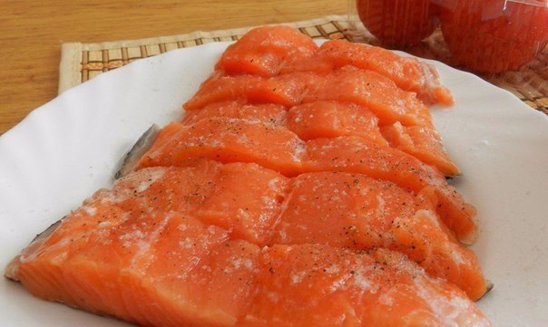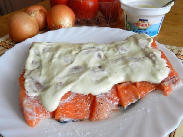 Семгу очистить от чешуи и плавников, вынуть хребет, посолить, поперчить.Сметану смешать с горчицей.